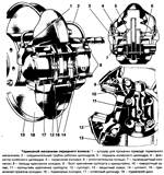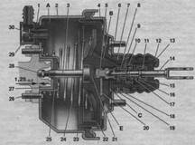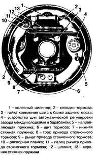 Диск прикреплен к ступице колеса, а суппорт, охватывающий диск тормоза, прикреплен к кронштейну, установленному на поворотной цапфе. Внутри суппорта находятся колесные гидравлические цилиндры с поршнями, передающими усилия на колодки с фрикционными накладками. Задние тормоза 39 - барабанные, с самоустанавливающими колодками, с приводом от одного главного цилиндра или от рычага механического привода. В алюминиевом барабане заднего тормоза находится чугунное рабочее кольцо.