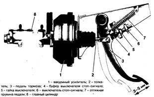 Положение выключателя стоп-сигнала регулируется его перемещением при отпущенной гайке 5 (рис. 10). Установите его так, чтобы буфер стоп-сигнала слегка касался упора педали, при этом свободный ход педали должен быть 3-5 мм. По окончании регулировки затяните гайку 5.