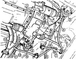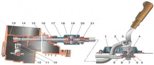 Привод управления коробкой передач 1 - защитный чехол тяги; 2 - тяга привода управления коробки передач; 3 - рычаг переключения передач; 4 - палец сферического рычага переключения передач; 5 - обойма шаровой опоры; 6 - шаровая опора рычага переключения передач; 7 - буфер; 8 - пружина; 9 - реактивная тяга; 10 - рычаг штока выбора передач; 11 - рычаг выбора передач; 12 - картер коробки передач; 13 - картер сцепления; 14 - шток выбора передач; 15 - втулка штока; 16 - сальник штока; 17 - защитный чехол; 18 - корпус шарнира; 19 - втулка шарнира; 20 - наконечник шарнира; 21 - хомут.