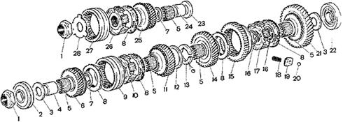 - если взамен шестерни или вторичного вала устанавливают одноименные детали новой конструкции, то их надо менять комплектно, то есть при замене шестерни меняется и вторичный вал и наоборот. В этом случае шайба не устанавливается.