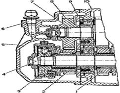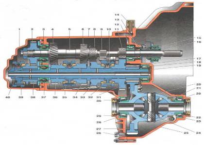 Коробка передач 1 - задняя крышка картера коробки передач; 2 - ведущая шестерня V передачи; 3 - шариковый подшипник первичного вала; 4 - ведущая шестерня IV передачи первичного вала; 5 - первичный вал; 6 - ведущая шестерня III передачи первичного вала; 7 - картер коробки передач; 8 - ведущая шестерня II передачи первичного вала; 9 - шестерня заднего хода; 10 - промежуточная шестерня заднего хода; 11 - ведущая шестерня I передачи первичного вала; 12 - роликовый подшипник первичного вала; 13 - сальник первичного вала; 14 - сапун; 15 - подшипник выключения сцепления; 16 - направляющая втулка муфты подшипника выключения сцепления; 17 - ведущая шестерня главной передачи; 18 - роликовый подшипник вторичного вала; 19 ~ маслосборник; 20 - ось сателлитов; 21 - ведущая шестерня привода спидометра; 22 - шестерня полуоси; 23 - коробка дифференциала; 24 - сателлит; 25 - картер сцепления; 26 - пробка для слива масла; 27 - ведомая шестерня главной передачи; 28 - регулировочное кольцо; 29 - роликовый конический подшипник дифференциала; 30 - сальник полуоси; 31 - ведомая шестерня I передачи вторичного вала; 32 - синхронизатор I и II передач; 33 - ведомая шестерня II передачи вторичного вала; 34 - ведомая шестерня III передачи вторичного вала; 35 - синхронизатор III и IV передач; 36 - ведомая шестерня IV передачи вторичного вала; 37 - шариковый подшипник вторичного вала; 38 - ведомая шестерня V передачи вторичного вала; 39 - синхронизатор V передачи; 40 - вторичный вал.