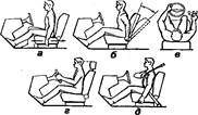 Перевіряючи правильність посадки, водій вмикає важіль перемикання передач у максимально віддалене від нього положення вперед. При цьому не повинно бути нахилу корпуса і відриву його від спинки сидіння. Ліва рука повинна бути повністю випрямлена і вільно лежати на верхній частині рульового колеса (в). Якщо конструкцією передбачено регулювання важеля перемикання передач по висоті, слід цим скористатися. Підголовник встановлюють так, щоб при ударі в автомобіль ззаду не допустити переміщення голови назад. Верхня частина підголовника повинна знаходитися на рівні верхньої частини вуха водія (г) або упиратися в потилицю. Ремінь безпеки регулюють так, щоб під нього туго входила долоня правої руки на рівні грудей (д).