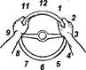Щоб точніше визначити положення рук на кермі, користуватимемося умовним позначенням чисел на циферблаті годинника. Вихідне положення рук перед поворотом: ліва-9, права-3 (поз. 1).