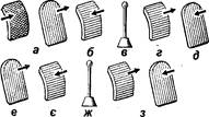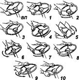 Права рука на повну силу включається в роботу, а для лівої настає черга швидкісного перехвату - стрімкий рух вгору від цифри до цифри 12 і м'який обхват; права рука при цьому продовжує обертати рульове колесо. Цикл повторюється. За аналогічною схемою роблять поворот ліворуч (б).