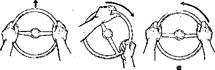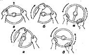 Під час відпрацювання повороту праворуч (а) правою рукою з вихідного положення (поз.1) повертають рульове колесо до моменту розтуляння пальців і перехвату через тильний бік кисті (поз.2). Обертають рульове колесо тильним боком кисті (поз. З), а надалі -відкритим обхватом через ребро долоні (поз. 4).