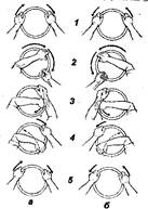 При подальшому повороті рульового колеса здійснюється перехід від відкритого до закритого обхвату (поз.5). Такий самий спосіб для правої руки відпрацьовують при повороті ліворуч (б). Типові помилки цього способу: нерівномірність обертання і втрата контакту кисті з ободом рульового колеса при перехваті.