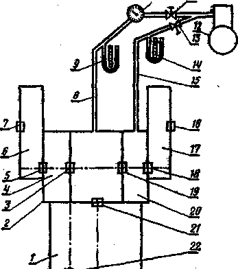 1 - корпус коробки передач; 2 - картер заднього моста; 3, 5, 7 16, 18, 19, 21, 22 -сальникове ущільнення; 4, 10 - правий я лівий відсіки муфт повороту; 6, 17 - кінцеві передачі; 8, 15 - трубопроводи з наконечниками для під'єднування до маслозаливної горловини; 9, 14 - п'єзометри (диференціальні манометри); 10 - датчик; 11, 13 - дроселі; 12 - компресор або балон із стислим повітрям.
