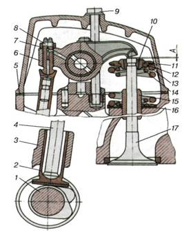 У двигуна КамАЗ-740 колінчастий вал через шестерний привід передає обертання розподільному валу (рис.1.1). При повороті розподільного вала його кулачок підіймає штовхач 2, а разом з ним і штангу 4, яка верхнім кінцем упирається в регулювальний гвинт коромисла 6. Коромисло повертається навколо осі і переміщує клапан 17 вниз. Відкривається отвір каналу в головці циліндра, а пружини 13 і 14, заздалегідь стиснуті (щоб утримати клапан у закритому положенні), ще більш стискаються.