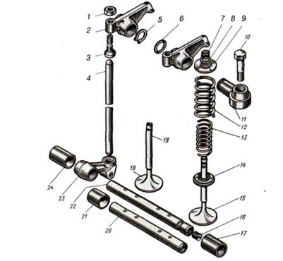 Особливістю механізму газорозподілу двигунів ЯМЗ-236 і ЯМЗ-238 є наявність роликових штовхачів. Деталі приводу клапанів цих двигунів зображені на рис. 1.2.
