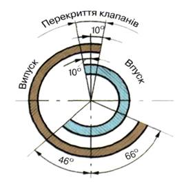 Випускний клапан відкривається теж з випередженням, тобто до закінчення такту робочого ходу, і частина газів, що знаходяться під невеликим тиском, викидається з циліндра. Це знижує протидію тиску газів, що залишились у циліндрі, зменшуючи витрату потужності на їхнє виштовхування. Закривається випускний клапан із запізненням, тобто після ВМТ, що забезпечує краще очищення камери згоряння від відпрацьованих газів. У якийсь момент обидва клапани виявляються одночасно відкритими. Настає, так зване перекриття клапанів, при якому гази, що виходять з циліндра, сприяють підсосу свіжого повітря в циліндр, що збільшує його наповнення та краще очищення від відпрацьованих газів.