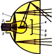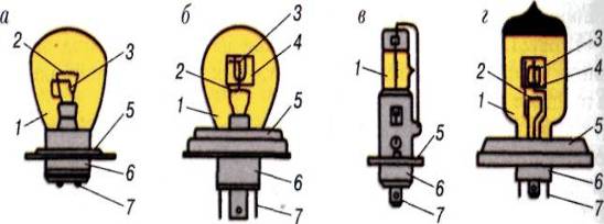 Лампи виготовляються газонаповненими і пустотними. Лампа головного освітлення (рис. 1.1, а) складається з цоколя 6 із фланцем 5 , колби 1, заповненої інертним газом, вольфрамових ниток розжарювання дальнього 2 і ближнього 3 світла й екрана 4. Для одержання двох світлових потоків дальнього і ближнього світла нитку 2 розташовують у фокусі відбивача, а нитку 3 – поза його фокусом.