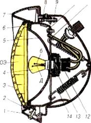 До цоколя двониткової лампи припаяний фланець, що забезпечує правильну установку лампи в оптичному елементі. Лампу закріплюють на відбивачі 5 у патроні 13. Цоколь лампи через відбивач 5 і провід 11 з'єднаний з «масою», а її контакти за допомогою патрона 13 і колодки 12 – із проводами, приєднаними до мережі.