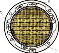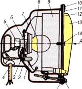 5 – колодка; 6 – пружина; 7 – відбивач; 8 – лампа основна; 9 – корпус; 10 – заклепка; 11 – пластина; 12 – обідок; 13 – розсіювач; 14 – гвинт; 15 – гвинт регулювальний;