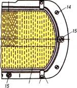 Обідок 12 фари разом зі склом розсіювача 13 кріпиться до корпусу 2 фари гвинтами 14 і пластинами 11, установленими на заклепках 10. Між обідком і корпусом фари, а також розсіювачем і корпусом 9 оптичного елемента встановлені ущільнювальні прокладки 16. У цих фарах встановлюють основну лампу 8 з екранованою ниткою ближнього світла і лампу стоянкового світла 1. Параболічний відбивач 7 має зрізи верхньої і нижньої частин.