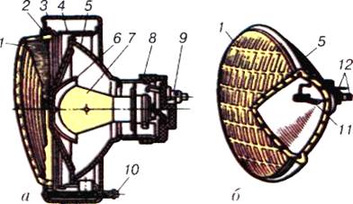 а – протитуманна фара; б – лампа-фара; 1 – розсіювач; 2 – гумова прокладка; 3 – обідок;