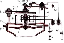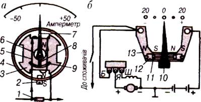 Магнітоелектричний амперметр із нерухомим магнітом (рис. 1.13, 6) складається із шини 13, нерухомого магніту 12, якірця 11 і стрілки 10 із противагою. Гасіння коливань стрілки при вмиканні і вимиканні струму в ланцюзі і при поштовхах автомобіля здійснюється застосуванням спеціального змащення опор осі стрілки.