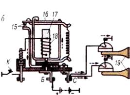 Здвоєні тональні сигнали, розраховані на напругу 24 В, споживають струм до 20 А, що може викликати швидке обгорання контактів кнопки ввімкнення. Щоб цього не відбувалося, сигнали вмикають у ланцюг через реле сигналів (рис. 1.7, б) за допомогою затисків Б і С. У цьому випадку в обмотку реле 18 через кнопку К буде проходити струм не більше 0,5 А; ввімкнення ж ланцюга сигналів відбувається через срібні контакти реле, розраховані на велику силу струму.