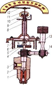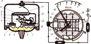Рис. 1.8. Схема магнітоелектричного покажчика тиску масла або повітря: