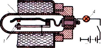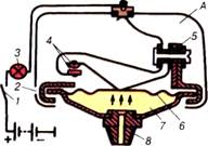 При роботі приладу струми в котушках, а відповідно, і магнітні потоки їх залежать від положення повзунків 8 на обмотці 10 реостата датчика. Коли в камері датчика 1 немає надлишкового тиску, то повзунки 8 під дією пружини 13 знаходяться в крайньому лівому положенні, що зумовлює ввімкнення максимального опору датчика в ланцюг приймача. У цьому випадку сила струму в котушці Кі буде максимальною, а в котушках К2 і К3 – мінімальною. При ввімкненому ланцюзі і відсутності тиску масла або повітря на діафрагму 4 повзунки 8 датчика вмикають велику частину опору реостата в ланцюг приймача. Коли тиск масла або повітря зростає, то діафрагма 4 прогинається нагору і через штир 2 переміщує важілець 6 навколо осі. Важілець через регулювальний гвинт 7 діє на повзунок 8 і переміщує його вправо. Опір реостата датчика вимикається, у результаті чого збільшуються струми в котушках К2 і К3 приймача. При цьому змінюється положення магніту 16 і жорстко зв'язана з ним стрілка відхиляється вправо у бік більшого значення. Сигналізатор аварійного тиску масла або повітря складається з датчика і сигнальної лампи. Він попереджує водія про надмірне зниження тиску масла в системі мащення двигуна або повітря в пневмосистемі гальм автомобіля. Датчик А сигналізатора аварійного тиску масла (рис. 1.9.) вкручується в масляну магістраль двигуна, а сигнальна лампа 3 розташована на щитку приладів. Сигналізатор з'єднаний із джерелом струму вимикачем 1. При непрацюючому двигуні (або коли тиск масла нижче допустимого – 0,04–0,08 МПа) діафрагма 6 знаходиться у вихідному положенні, контакти 4 замкнуті і сигнальна лампа 3 ввімкнена в ланцюг (горить). При працюючому двигуні масло з магістралі надходить через штуцер 8 у камеру 7 під діафрагмою. При підвищенні тиску масла діафрагма 6, прогинаючись, піднімає пружну пластину верхнього контакту, контакти розмикаються і вимикають сигнальну лампу 3. Сигналізатор регулюється на заданий тиск підгинанням вгору або вниз пластини нижнього контакту 4. Другий кінець пластини з'єднаний із кронштейном 5 і з затискним гвинтом, ізольованим від кришки датчика А сигналізатора. Регулювання зазору між контактами здійснюють стрижнем, що вводиться в отвір 2 кришки. Сигналізатор тиску повітря в гальмовій системі працює аналогічно. Вмикається сигнальна лампа при зниженні тиску нижче 0,45–0,50 МПа.