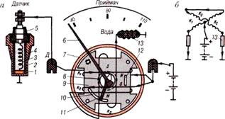 Між корпусом датчика 5 (рис. 1.8, а) і кришкою 9 розміщена гофрована діафрагма 4 зі штирем 2. Важілець 6 вільно хитається на осі і відводиться у вихідне положення пружиною 13, що діє на подвійний повзунок 8. Гвинтами 3 і 7 важільців забезпечується установка стрілки приймача 18 у вихідне положення. Обмотка реостата 10 з'єднана з контактною пластиною 11. Для кращого контакту повзунок з'єднаний з масою мідним провідником 12.