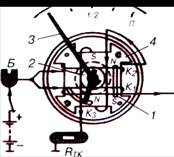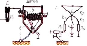 Резистор температурної компенсації R тк і додатковий резистор R д, ввімкнені в ланцюг котушок К1, К.2, К3 приймача, служать для підтримки постійного опору цього ланцюга незалежно від температури обмоток. Крім того, додатковий резистор обмежує силу струму в ланцюзі приймача при вимкненому реостаті датчика.