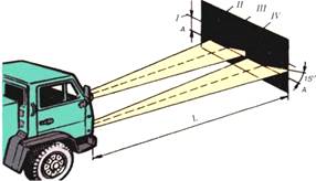 При установці автомобіля на віддаленні 10 ±0,05 м, 7,5 і 5 м відстань від лінії І до лінії А відповідно повинна бути 250, 190 і 125 мм.