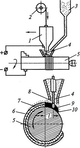 Дуговая наплавка под флюсом. Способ широко применяется доя восстановления цилиндрических и плоских поверхностей деталей. Это механизированный способ наплавки, при котором совмещены два основных движения электрода —. это его подача по мере оплавления к детали и перемещение вдоль сварочного шва.