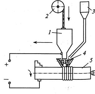 Рис. 3. Схема автоматической дуговой наплавки цилиндрических деталей под флюсом: