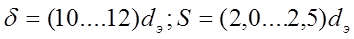 При наплавке сварку обычно ведут постоянным током обратной полярности. Напряжение сварочной дуги задают в пределах 25...35 В, скорость наплавки составляет 20...25 м/ч, подачи проволоки — 75... 180 м/ч. Вылет электрода и шаг наплавки зависят от диаметра проволоки и определяются по формулам: