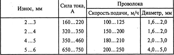 Для наплавки деталей с большим износом рекомендуется применять автоматическую наплавку порошковой проволокой, в состав которой входят феррохром, ферротитан, ферромарганец, графитовый и железные порошки. Используют два типа порошковой проволоки: для наплавки под флюсом и для открытой дуги без дополнительной защиты. Режимы наплавки зависят от марки проволоки и диаметра детали. Разбрызгивание электродного материала во время наплавки можно уменьшить, используя постоянный ток низкого напряжения (20 ...21В). Выпускаются проволоки для сварки и наплавки как стальных, так и чугунных деталей (ПП-АН1, ПП-1ДСК и др.)