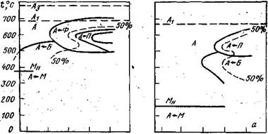 Рисунок 2 – Диаграмма изотермического превращения переохлажденного аустенита для цементуемых стали 12ХН3А в нецементованном (слева) и цементованном (справа) состояниях