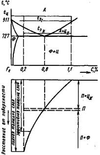 Рисунок 3 – Участок диаграммы Fе–FезС. Изменение содержания углерода и структуры по толщине цементованного слоя (схема): t ц – температура цементации; t31 – температура нагрева при первой закалке; t32 – температура нагрева при второй закалке.