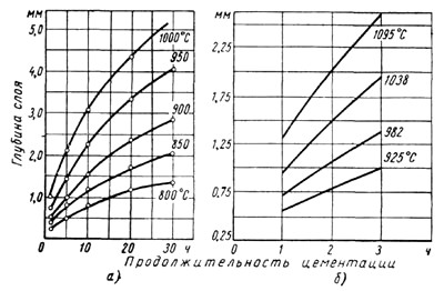 Продолжительность периода выдержки для получения цементованного слоя заданной глубины зависит главным образом от температуры и требуемой глубины слоя, при этом имеют значение также активность карбюризатора и химический состав цементуемой стали.
