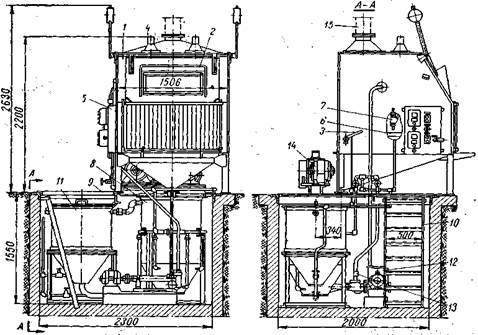 1 – камера; 2 – дверца с резиновой занавеской; 3 – ручка управления клапаном; 4 – фонарь; 5 – пульт управления; в- поворотный стол; 7 – пистолет; 8 – смеситель; 9 – настил из металлических листов; 10 – лестница; 11 – отстойник; 12 – насос для пульпы; 13 – трубопровод; 14 – привод смесителя; 15 – вытяжная труба.