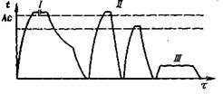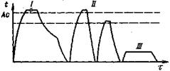 Рисунок 7 ‑Режим термической обработки ответственных деталей машин после цементации (схема): / – цементация; II – двойная закалка; /// – низкий отпуск