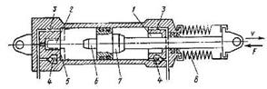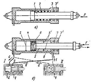 Гидроцилиндр одностороннего действия (рис. 1. а) имеет плунжер 1, перемещаемый силой давления жидкости в одну сторону. Обратный ход плунжера совершается под действием внешней силы F, если она действует непрерывно, или пружины 2. единственное наружное уплотнение плунжера состоит из основного 3 и грязезащитного 3’ уплотняющих элементов. Гидроцилиндр двустороннего действия (рис. 1. б) имеет поршень 4 со штоком 5, уплотненные внутренним 6 и наружным 7 уплотнителями. Разница полной S и кольцевой S’ площадей поршня ведет к различию в используемом давлении p при перемещении влево и вправо, если преодолеваемая внешняя сила F одинакова. Если к цилиндру подводится постоянный расход Q, то разница площадей приводит в зависимости от направления перемещения к различию скоростей движений поршня.