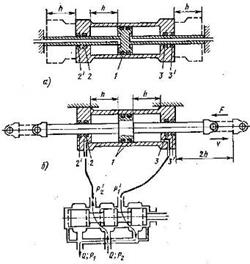 Для устранения этих явлений, когда они нежелательны, такие гидроцилиндры включают при помощи золотника по дифференциальной схеме (см. позиции I и II), при которой штоковая полость 8 непрерывно соединена с питающей линией 9. Если при этом S’=S/2, то при движении вправо (позиция золотника I) и влево (позиция золотника II) скорость v=Q/S’ и сила F=pS’ будут одинаковы. Для получения полной симметрии сил и скоростей применяют гидроцилиндры с двусторонним штоком (рис. 2) с одним внутренним 1 и двумя 2 и 3 наружными уплотнениями. В этом случае конструкция с закрепленным штоком (рис. 2. а) в полтора раза короче, чем конструкция с закрепленным цилиндром (рис. 2. б)