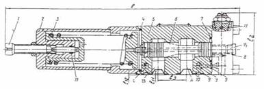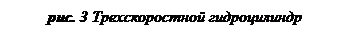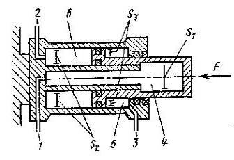 Схема трехскоростного гидроцилиндра с двумя уровнями развиваемой силы показана на рис 3. Такие гидроцилиндры распространены в прессовом оборудовании. Быстрый ход сближения осуществляется заполнением полости через подвод 1 при линиях 2 и 3, соединенных с областью слива. Рабочий ход с малой скоростью на коротком пути осуществляется при питании полостей 4 и 6 через подводы 1 и 2. При этом цилиндр, используемый при максимальной рабочей площади, развивает максимальную силу при наименьшем давлении. Быстрый возвратный ход производится при заполнении полости 5 через линию 3, линии 1 и 2 при этом соединены с областью слива.