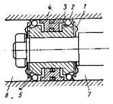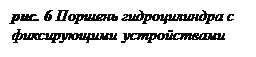 Частым требованием к гидроцилиндрам является способность удерживать нагрузку при неподвижном поршне без подачи жидкости от насоса. Схема фиксирующего устройства на поршне 5 представлена на рис. 6. При равенстве давления в обеих полостях 6 и 7 цилиндра пружины 1 смещают шарики 2 на коническую поверхность 3, и шарики заклинивают поршень. При подаче жидкости от насоса в одну из полостей в ней появляется давление и скользящий уплотняющий элемент 4 смещается. Таким образом, перед началом движения поршня шарики выталкиваются из кольцевой корпусной щели и не препятствуют движению поршня. Такая система из-за износа стенок цилиндров применима только при малых нагрузках.