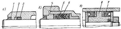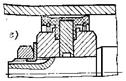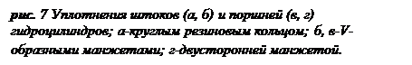 Эффективность работы гидроцилиндров, их КПД зависят в основном от работы уплотнителей поршней и штоков (рис. 7). Уплотнение, показанное на рис. 7,а состоит из резинового кольца 3 с пластиковым упорным кольцом 2 и защитного кольца 1, предохраняющего основное уплотнение от попадания грязи. Конструкция, изображенная на рис. 7,б представляет пакет V-образных манжет: уплотняющая 6 из резины и разделительных 5 из пластика. Гайкой 4 пакет может сжиматься для компенсации износа. На рис. 7,в и г представлены уплотнения поршней двустороннего действия: уплотнение высокого давления манжетами 7 поршня с направляющим поясом 8 и уплотнение двусторонней манжетой, служащей одновременно направляющим элементом. Последнее предназначено для умеренных давлений. Для надежной и продолжительной работы уплотнений и, следовательно, гидроцилиндров необходима обработка рабочих поверхностей цилиндров и штоков до