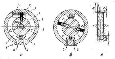 На рис. 9,а изображен однопластинчатый двухкамерный, а на рис. 9,б – двухпластинчатый четырехкамерный двигатели. В конструкции таких гидродвигателей много общего с пластинчатыми гидромашинами. Ротор 4 уплотнен радиально относительно наружного корпуса 3 подвижной 5 и неподвижной 1 пластинами, которые образуют две или больше дуговые камеры 2 и 2’ – рабочие полости, в которые по каналам 6 подается и отводится жидкость. Для сокращения и устранения внутренних утечек по торцам ротора и пластин применяют подгонку боковых крышек с малыми зазорами, поджим одной из крышек с гидростатической разгрузкой или радиальные упругие уплотнения из резины или полимерных материалов. Надежное уплотнение торцов ротора является главной трудностью при создании таких гидродвигателей. Трение и утечки по торцам являются главными потерями энергии. Уплотняющие пластины выполняют для сокращения трения, как правило, гидростатически уравновешенными (рис. 9,в).