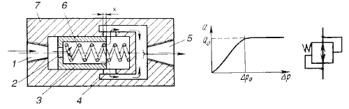 Принципиальная схема ограничителя расхода приведена на рис.12. Он состоит из подвижного поршня 3 и нерегулируемой пружины 6, помещенных внутри корпуса 7. В поршне имеется калибровочное отверстие 2 (нерегулируемый дроссель), а корпусе - окна 4. В сочетании с поршнем 3 окна 4 представляют собой регулируемый дроссель. В исходном положении пружина стремится передвинуть поршень в крайнее левое положение и открыть окна 4. При включении ограничителя расхода в гидросистему жидкость поступает в отверстие 1 и далее проходит через дроссель 2 и окна 4 к отверстию 5. При достижении жидкости через ограничитель расхода у дросселя 2 создается перепад давлений. При увеличении расхода перепад давлений увеличивается и поршень перемещается вправо, частично или полностью перекрывая окна 4. Когда расход в гидросистеме уменьшится, перепад давлений также уменьшится и поршень переместится влево, увеличив открытие окон.