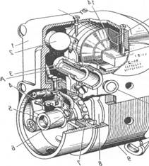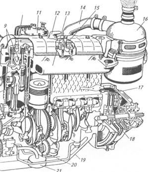 Рисунок 1. Двигатель А-41 (разрез): 1— коленчатый вал; 2— распределительный вал; 3 — шатун; 4— поршень;5— вентилятор; 6— водяной насос; 7— блок-картер; 8— головка цилиндров; 9— клапан; 10— клапанная коробка; 11— фильтр тонкой очистки 12— сапун; 13— выпускной коллектор; 14— впускной коллектор; 5— декомпрессионный механизм;16—воздухоочиститель; 17— маховик; 18—муфта сцепления;19— поддон;20— уравновешивающий механизм; 21— маслоприемник; 22 –масляный насос.