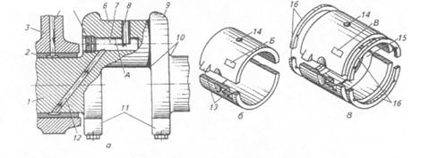 Рисунок 2. Коленчатый вал и вкладыши: а- часть коленчатого вала; б, в-вкладыши шатунного и коренного подшипника; 1-коренная шейка; 2-вкладыш,3-перегородка блок-картера;4,12-каналы;5-пробка;6-шатунная шейка;7-полость;8-трубка;9-щека;10-галтель;11-противовес;13-усик;14-отверстие; 15-канавка;16-упорные полукольца; А-слой механических примесей; Б,В- метки.