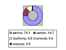 Обсяги і структуру перевезення пасажирів і вантажів характеризують дані рис. 1. Як бачимо, у відправленнях пасажирів переважає автомобільний транспорт. Помітно є частка залізничного – 14,1% і дуже незначною – морського, річкового і авіаційного. Міський електричний транспорт (трамвай, тролейбус, метрополітен) є специфічним видом, тому що здійснює перевезення виключно в середині населених пунктів.