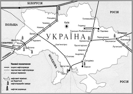 В Україні діють нафтопроводи Долина (Івано-Франківська обл.) — Дрогобич (Львівська обл.), Битків — Надвірна (Івано-Фран¬ківська обл.), Качанівка – Охтирка (Сумська обл.), Тнідинці – Прилуки (Чернігівська обл.) – Кременчук (Полтавська обл.) – Херсон, Кременчук – Черкаси, Самара – Лисичанськ – Кремен¬чук – Херсон, який через Снігурівку підведено до Одеси. Через нього надходить в Україну сибірська нафта. Через територію західних областей (Волинської, Львівської, Закарпатської) В 1963 р. прокладено європейський нафтопровід "Дружба". У 1975 р. став до ладу нафтопродуктопровід Кременчук – Лубни – Київ. Нафтопровідним транспортом нині поставляється 93,6 % усієї нафти, яку споживає Україна. Нафтопровідний транспорт України має 12 основних нафтопроводів 2,6 тис. км завдовжки. Діаметр труб — 720 мм. Система нафтопроводів забезпечувала доставку нафти в основному з Росії. Однак у зв'язку з різким зменшенням видобутку нафти в Росії виникла потреба в закупівлі на світовому ринку. Розробляється кілька варіантів транспортування нафти. Найоптимальніший – у порти Одеса та Південний танкерним флотом з країн Близького Сходу й південного Середземномор'я, перевалка її в Одесі й перекачування нафтопроводами на нафтопереробні заводи Херсона, Кременчука й Лисичанська. Частково нафта перероблятиметься на Одеському нафтопереробному заводі, що потребує його реконструкції. Ця схема забезпечує економічну незалежність України завдяки можливості закупівлі нафти у кількох держав і транспортування її безпосередньо в Україну без транзиту через інші країни. Мережа Нафтопроводів здатна забезпечити зворотне постачання нафти з Одеси. Однак потрібне будівництво другої нитки нафтопроводу, посилення ряду нафтопроводі для пропускання великого обсягу нафти: Одеса – Снігурівка (від 19 до 45 млн т); Снігурівка – Кременчук (від 26 до 37 млн т), а також переобладнання насосних станцій для реверсу нафти. Одночасно виникає потреба в створенні державного запасу нафти близько 15 млн т. В Україні є геологічні формації, сприятливі для створення підземних сховищ такого обсягу (Дніпропетровське-Донецька западина, Український кристалічний щит).У перспективі важливе значення для забезпечення України нафтою матимуть поставки з країн Близького і Середнього Сходу. Поставлятиметься вона танкерами до Одеського порту, де через нафтотермінал потраплятиме на Одеський нафтопереробний завод і через систему нафтопроводів — на Херсонський, Кременчуцький і Лисичанський нафтопереробні заводи. Будівництво нафтопроводу з Одеси до нафтопроводу «Дружба» сприяло б поставкам нафти з цих регіонів і Азербайджану в країни Центральної та Західної Європи з наданням Україною транспортних послуг. Для ефективнішого функціонування галузі потрібно буде модернізувати нафтопроводи від Одеси до Херсона і Кременчука, що дасть змогу збільшити обсяги транспортування, забезпечити реверс нафти. Газопровідний транспорт. Найбільші газопроводи Шебелинка — Харків, Шебелинка – Брянськ, Шебелинка – Дніпропетровськ – Кривий Ріг – Одеса – Кишинів, Шебелинка – Диканька – західні райони України. З Прикарпаття йдуть газопроводи на Чехію, Словаччину і Польщу. Через крайню східну частину України проходять траси газопроводів Північний Кавказ – Москва, північно-кавказький газ споживають також у Донбасі. В Украї