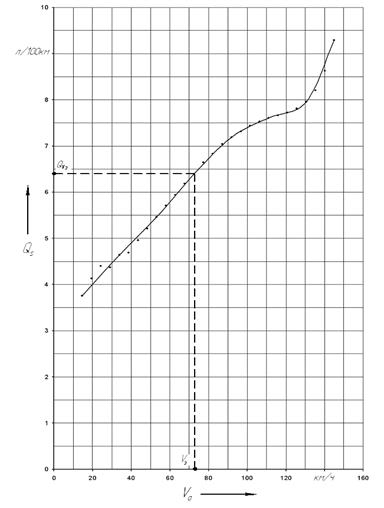 3) по графику топливной характеристики установившегося движения для эксплуатационной скорости Vэ определяем расход топлива QVэ : QVэ = 6,4 л/100км;