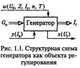 На рис.1.1. представлена структурная схема генератора как объекта управления, где Uo, Z, Ir, n, T - возмущающие воздействия; Iв - управляющее воздействие; Ur - регулируемая величина. Входной величиной генератора можно считать угловое перемещение Ga, а выходной - ток нагрузки Ir.