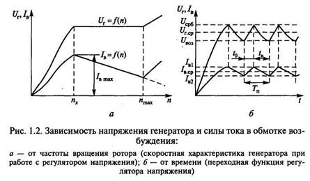 Зависимости силы тока возбуждения и напряжения генератора от времени показаны на рис.1.2, б. Время t0, в течение которого резистор отключен, с ростом частоты вращения уменьшается, а время /в, в течение которого он включен, увеличивается.