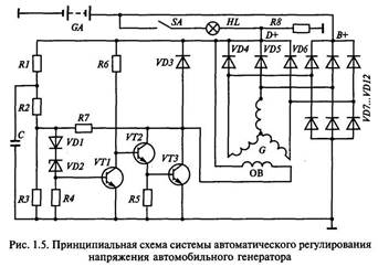 На рис.1.5. представлена принципиальная схема САР напряжения автомобильного генератора типа EE14V3 фирмы Bosch, работа которой полностью соответствует ранее рассмотренной САР. Практические схемы усложняются за счет введения дополнительных элементов, улучшающих качество работы системы и ее динамические характеристики. Так, с помощью диода VD1 осуществляют температурную компенсацию параметров стабилитрона, конденсатор С является фильтром на входе регулятора, сопротивление R7 выполняет функции жесткой обратной связи, обеспечивающей ускоренное переключение транзисторов, диод VD3 гасит обратное напряжение на транзисторах. Соединение транзисторов VT2 и VT3, при котором их коллекторные выводы объединены, а питание базовой цепи одного транзистора производится от эмиттера другого, называется схемой Дарлингтона. При таком соединении оба транзистора могут рассматриваться как один составной транзистор с большим коэффициентом усиления. Использование дополнительного выпрямителя VD4... VD6 до питания обмотки возбуждения устраняет разряд батареи GA при выключенном двигателе.